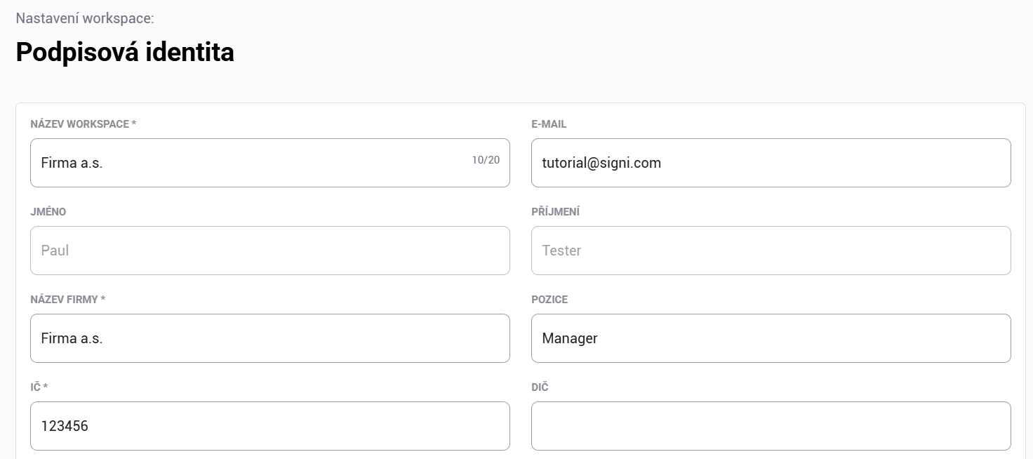 Nejprve vyplňte požadované údaje o sobě a vaší společnosti v úvodní části stránky podpisové identity.