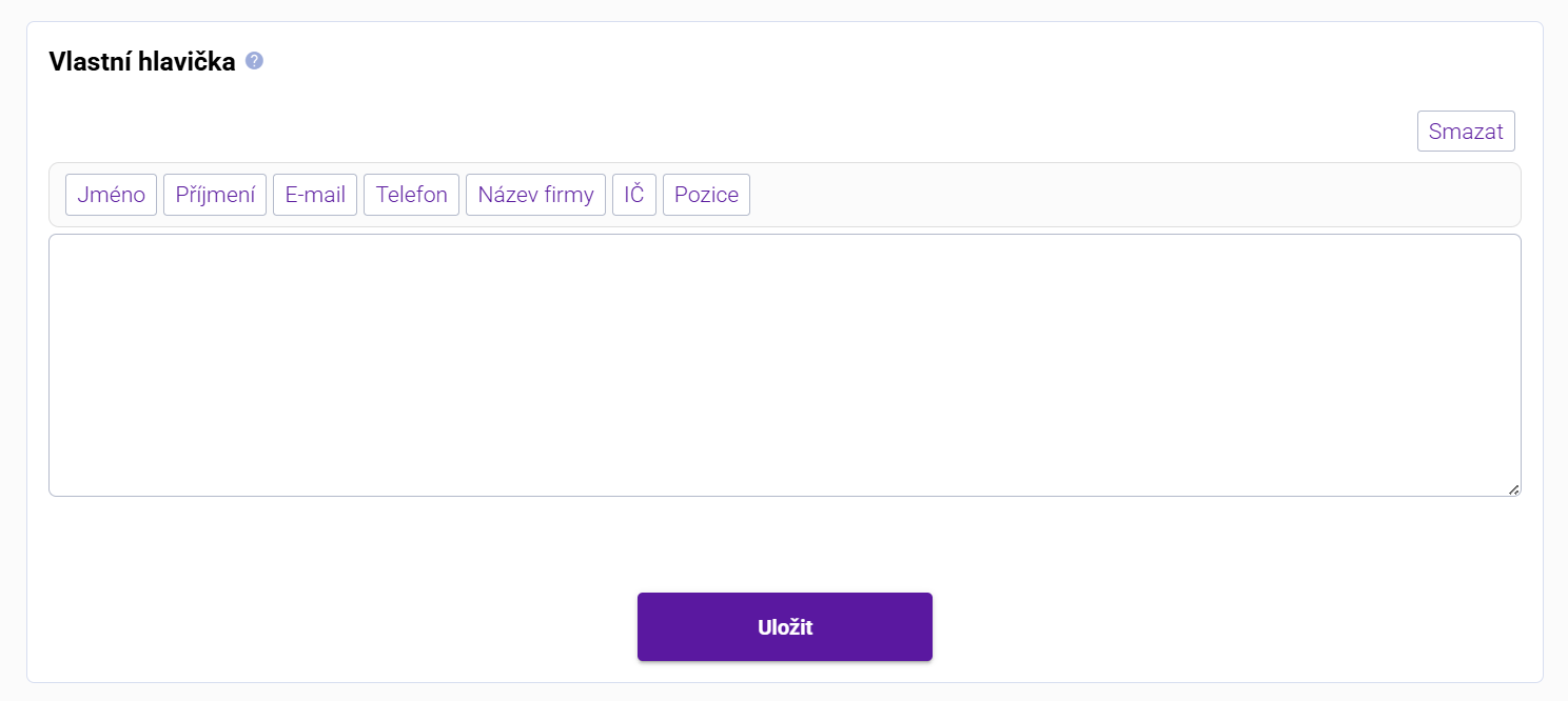 V druhé části stránky, zvané vlastní záhlaví, můžete volně uspořádat identifikační údaje nebo mezi ně vložit vlastní text.