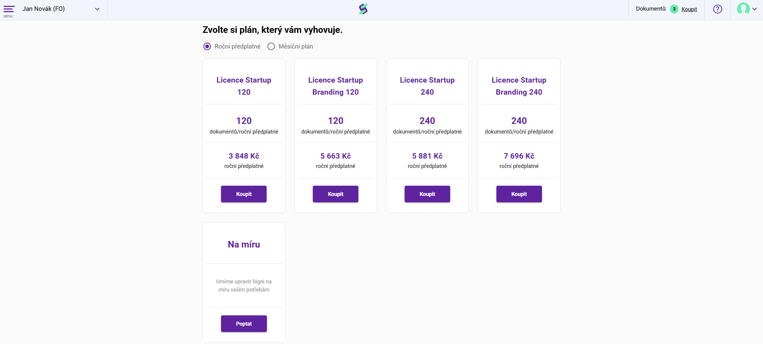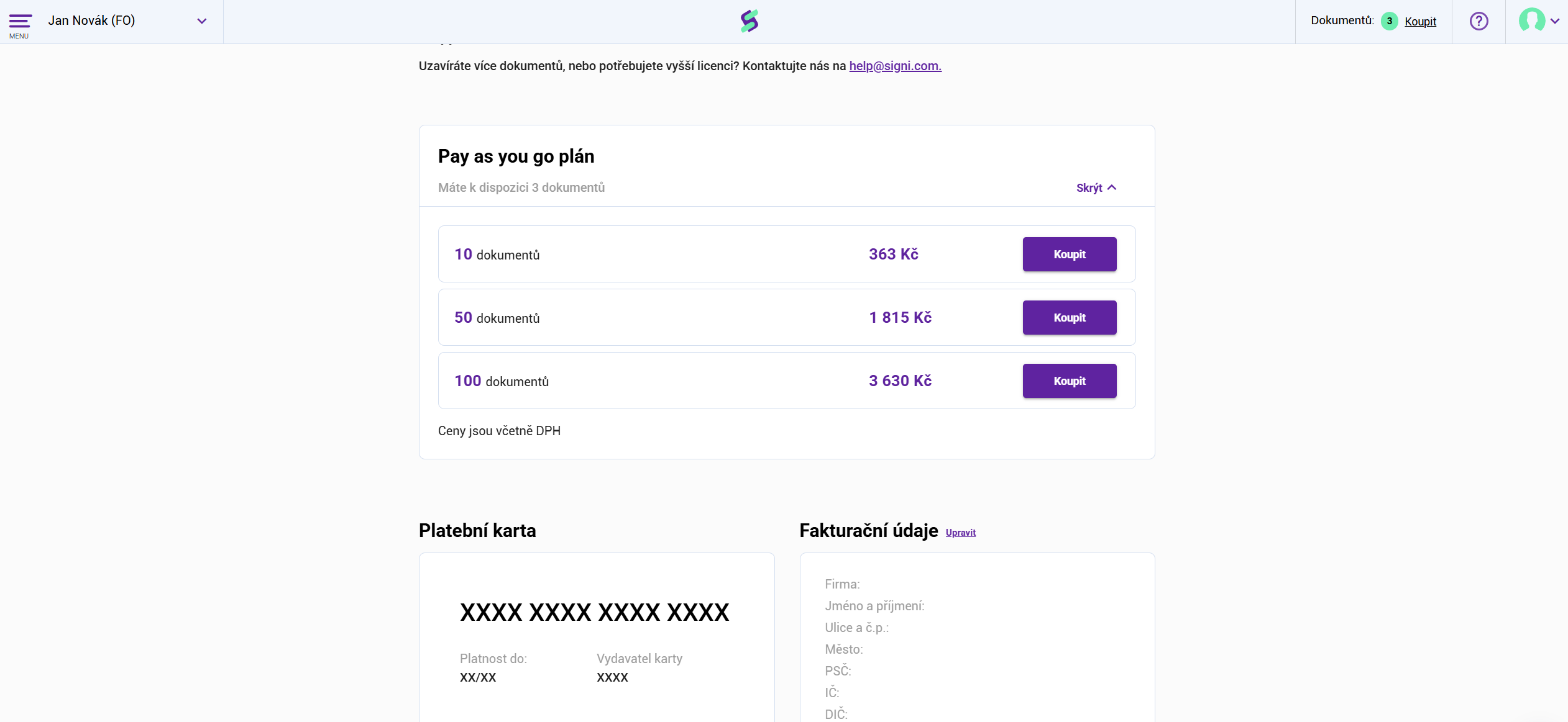 V sekci „Pay as You Go plán“ si vyberete variantu podle počtu dokumentů, které chcete zakoupit.