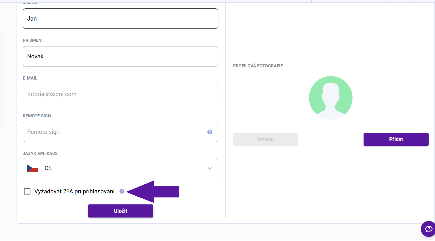 Nastavení 2FA (SMS) při přihlášení je dostupné pro všechny uživatele aplikace SIGNI.
